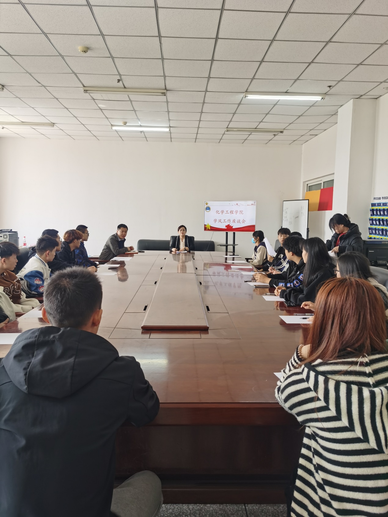 在北湖西区教学主楼826会议室召开2022-2023学年第2学期学风建设座谈会。教研副院长李贞玉、2022级学生辅导员程晓印以及大一、大二年级各班学习委员参加了此次座谈会。此次座谈会由李贞玉主持。