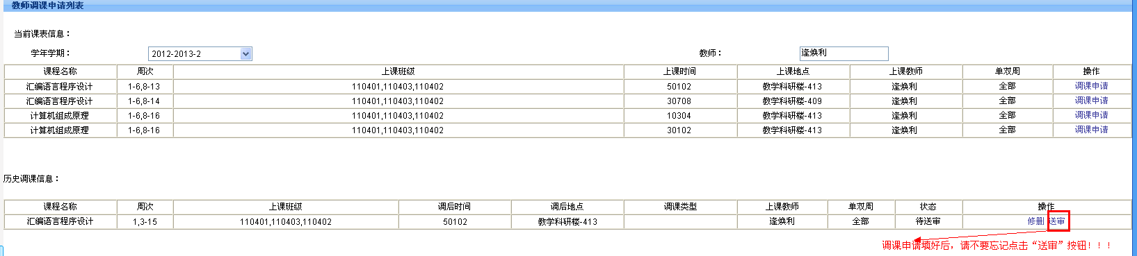 (4).选择时间地点完成后,将调课原因填写好后,“保存”后点击送审,完成调课申请。如图13