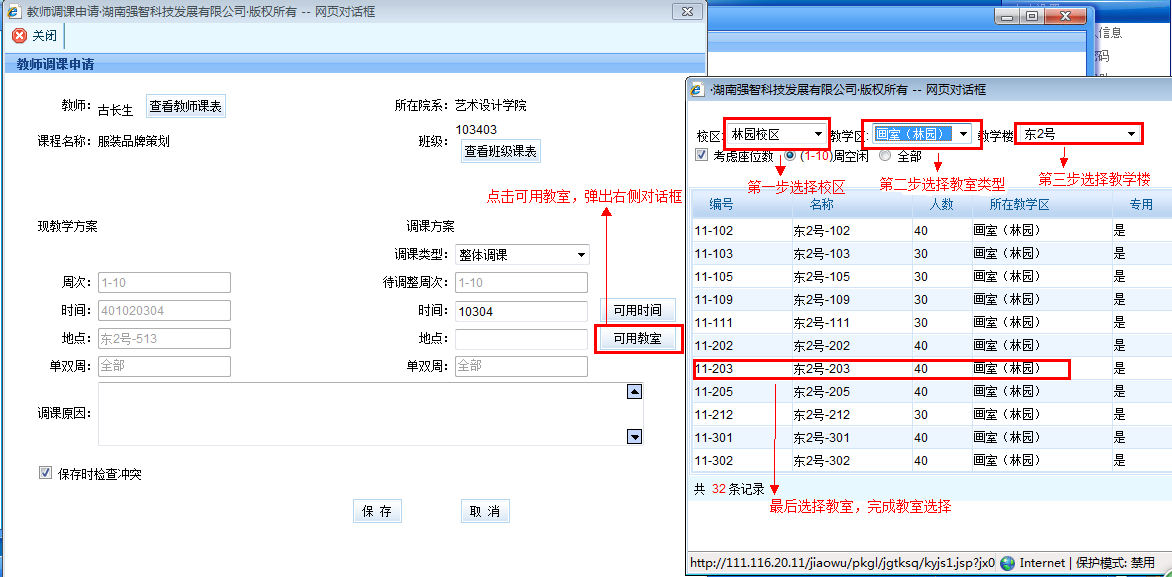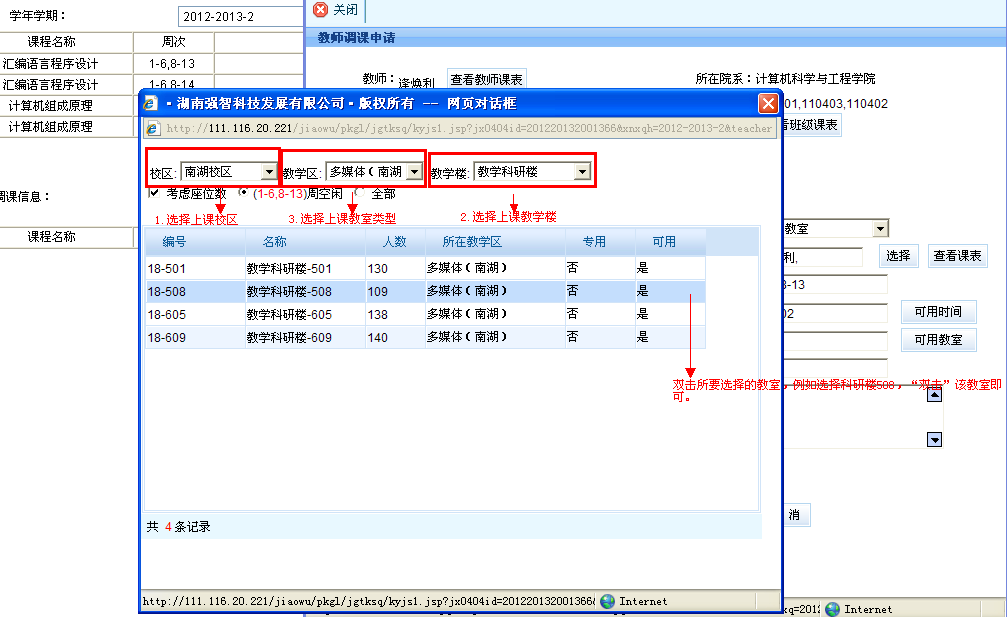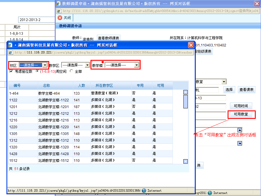 (3).选择时间后,点击“可用教室”——选择可用的“上课地点”双击即可。如图12