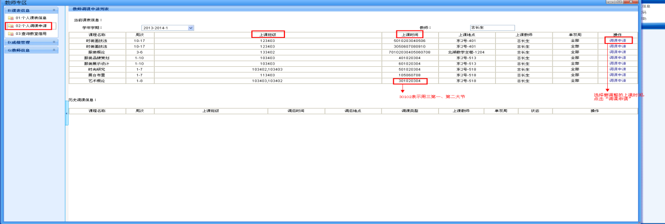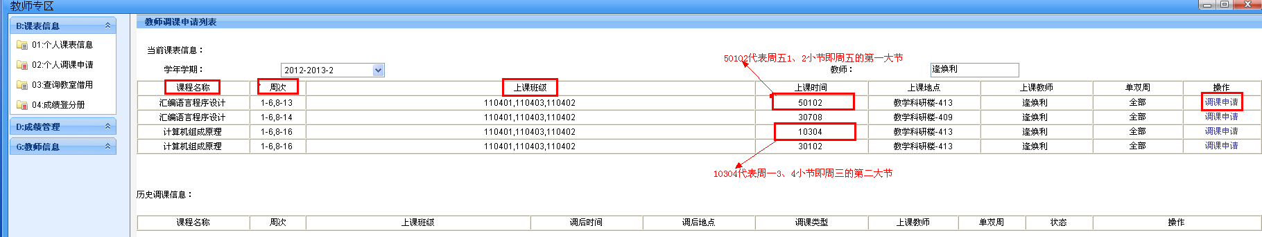 3.进入系统后点击“教师专区”——“B.课表信息”——“02.个人调课申请”,即显示本学期各位教师所上课程。如图3