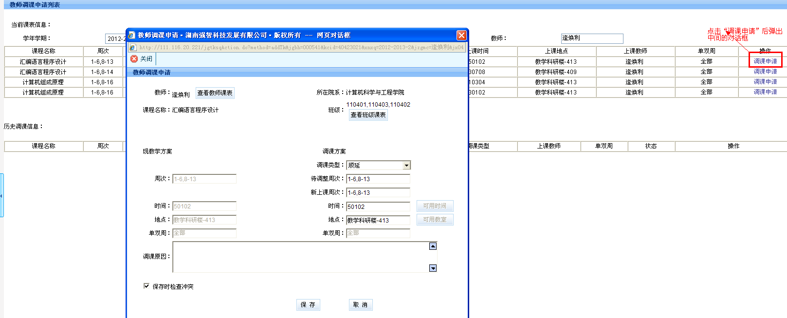 (2).点击调课申请,弹出对话框后,将“调课类型”选为“停课”,在调课原因框内写上更换教师原因与要更换教师的姓名,保存后点击“送审”即可。