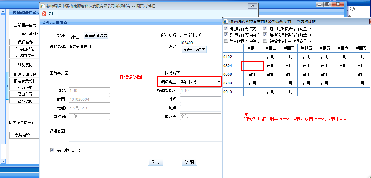 (2).进入教师调课申请界面下后,选择所需要调整的时间点后,点击调课申请,弹出对话框后,将“调课类型”选为“整体调课”,然后点击“可用时间”选择所需时间,如下图11
