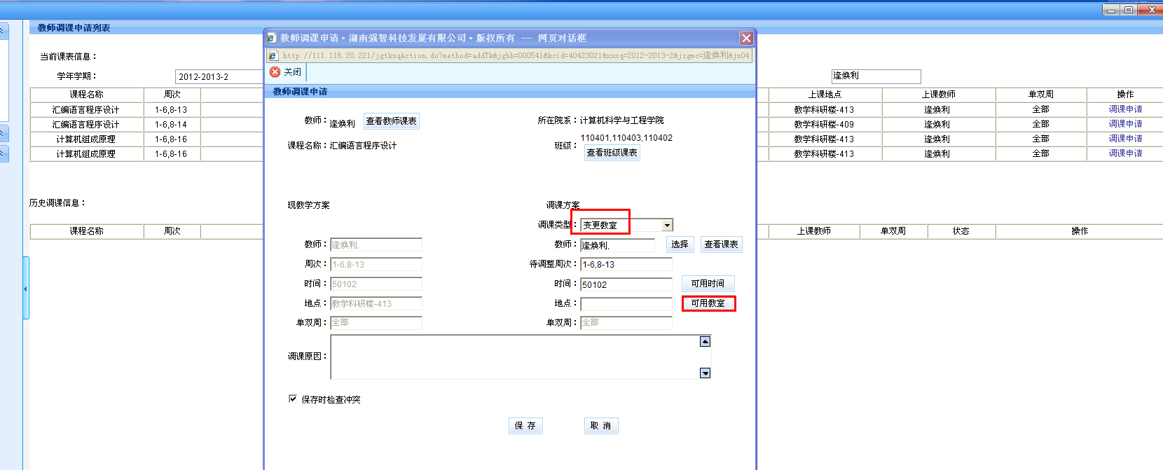 选择教室后在调课原因注明调课理由,点击保存后,完成调课申请。教师课通过右侧“审核记录”查询调课申请所处于哪个部分审核中。