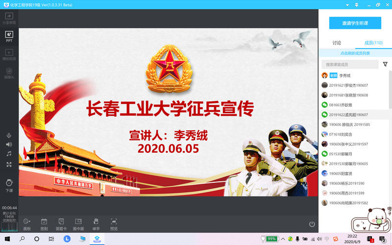 会上,李秀绒老师首先为同学们讲解了征兵入伍的基本条件,帮助大家了解、掌握征兵的全部流程和具体要求。随后,李老师重点介绍了大学生参军享有的优惠政策、学校的规定以及入伍期间的待遇问题。最后,李秀绒老师为大家提供了学校征兵官方渠道和联系方式,鼓励同学们应征入伍,献身国防事业。会议期间,学生们踊跃提问,气氛热烈。