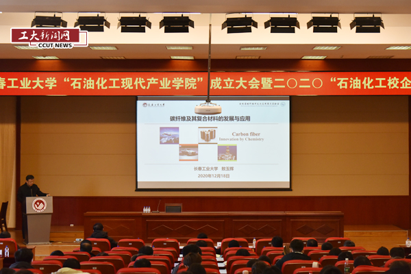 新闻网讯(通讯员孙树林)12月18日学校“石油化工现代产业学院”成立大会暨二零二零“石油化工校企论坛”在南湖校区学术报告厅举行。吉林省教育厅高教处处长宋辉,校长张会轩,副校长李占国出席会议,成立大会由副校长张明耀主持。吉林大学、中科院长春应用化学研究所、中国石油吉林石化公司研究院、吉林石化公司合成树脂厂、辽阳石化公司、大庆石化公司、中国中车长春轨道客车股份有限公司、吉林碳谷碳纤维股份有限公司、吉林精功碳纤维有限公司、吉林国兴复合材料有限公司、中国兵器北方华锦集团有限公司、天津利安隆新材料股份有限公司、双辽昊华化工有限公司、吉林省开顺新材料有限公司、长春吉原生物科技有限公司、吉林华邦新材料科技有限公司、吉林省龙展新材料科技有限公司、吉林中科金盛科技有限公司、吉林伊特胶管有限公司等二十二位专家学者代表出席本次会议。