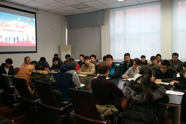 160604班团支部在学院会议室举办了一场别开生面的以“不忘初心、牢记使命”为主题的党的十九大精神专题学习会。学院团委书记、2016级辅导员杨楠老师参加了学习。学习会由团支部书记巨萌池主持。