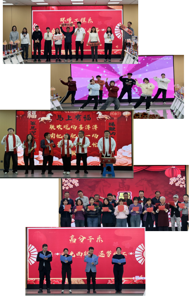 文艺表演环节精彩纷呈、高潮迭起。各系教职工精心编排的节目轮番登场,形式多样、内容丰富,充分展现了化工学院教职工的多才多艺与昂扬风采。舞蹈《刀马进行曲》动作整齐、活力满满,以优美的舞姿展现了教职工们积极向上的精神状态;《我会等》《最炫教师风》《我们的大中国》等歌曲类节目旋律悠扬、温情脉脉,既唱响了时代主旋律,也勾起了大家的共同回忆;三句半《新年变成大美人!》紧扣学院工作实际,语言诙谐、节奏明快,将教学科研中的日常点滴化为幽默的台词,引得现场掌声不断、笑声阵阵;诗朗诵《向光而行,逐梦化工》情感真挚、气势恢宏,抒发了对学院的热爱与对未来的憧憬,深深打动了在场每一位观众。跨部门联合编排的节目更是展现了团队协作的魅力,为联欢会增添了不少亮点。